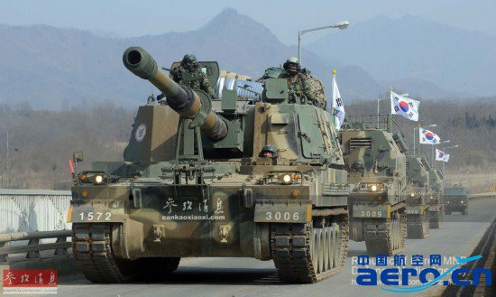 圖為在公路上開進的韓軍K-9自行火炮群。