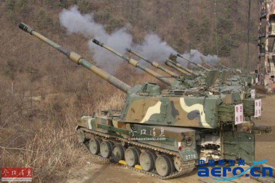 圖為韓陸軍K-9自行火炮群在山間進行齊射打靶。