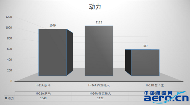 所有這三種飛機都使用的是一臺星形活塞發動機。H-21所使用的萊特旋風發動機要帶動兩個旋翼。西科斯基的H-34和H-19是傳統的單旋翼設計,前者有動力最大的發動機。最終,渦軸發動機替代了大多數直升機上的星形發動機,因為這種發動機比同等重量的活塞發動機輕,動力更大。