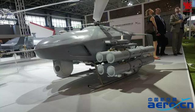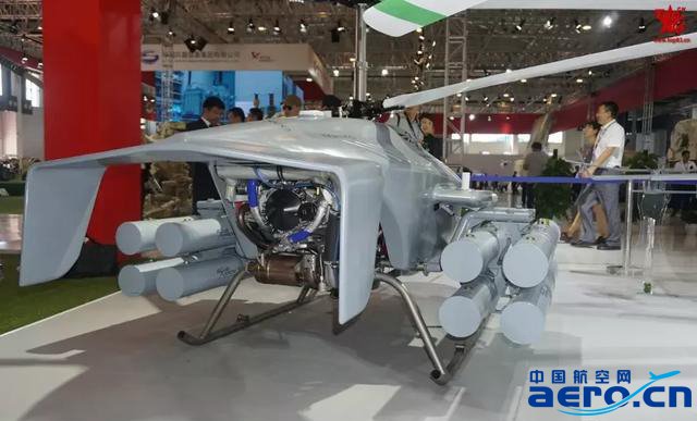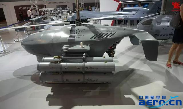 改進升級后的金雕500型察打一體無人直升機, 其掛載的空對地導彈型號與數量,也由2016年模型上掛載的2枚藍箭-9型 [AKD09型]空對地導彈裸彈,換成了8枚藍箭-5型筒裝空對地導彈,機體左右各懸掛4枚......