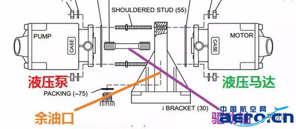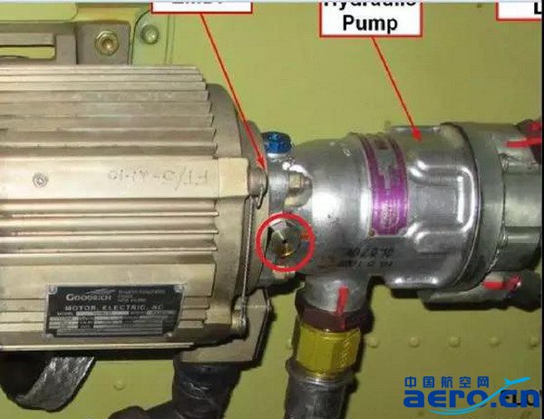 備用液壓系統(tǒng)EMDP的原理和EMDP類似,也是由一個(gè)馬達(dá)和液壓泵組成,連接軸和泵之間的封嚴(yán)也是使用的動(dòng)封嚴(yán),在馬達(dá)和泵的連接處有一個(gè)小孔,即為動(dòng)封嚴(yán)漏油時(shí)的余油口。
