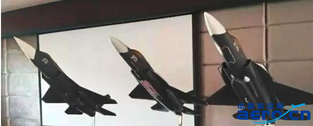 中間的那架看不清楚型號,似乎是從JF-17.6更進一步的隱形化,機腹設計了內部彈艙,進氣口似乎有所修正,而其余部分都與JF-17.6差不多。由于安裝了彈艙,減少了內載燃油量,所以模型還加上了強掛油箱。
