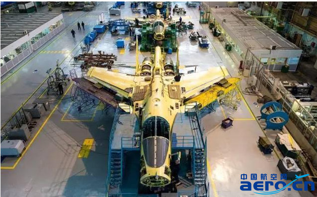 裝配線上的蘇-34,越往前的飛機完成度越高,最前面那架快要下線了。
