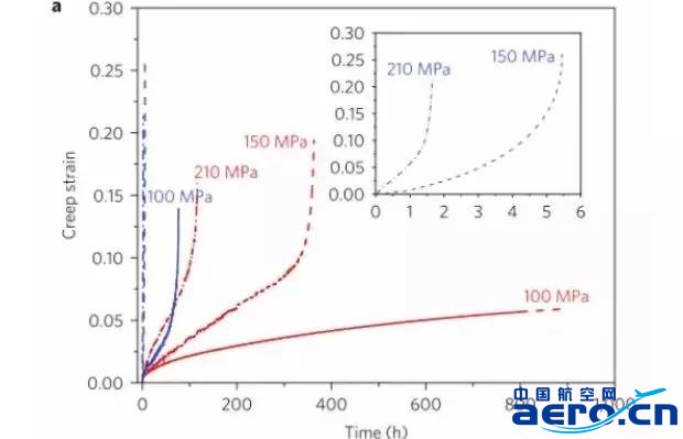 藍色線是美國波音客機GEnx引擎中的合金(簡稱4822合金)的蠕變抗力,紅線是陳教授的PST鈦鋁單晶,線條往上翹就表示掛了。解讀一下: