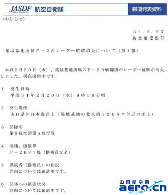 這架F-2B墜毀在福岡縣空軍基地東北約130公里處,現場海域可以看到漂浮的油料,而墜毀的F-2B部分殘骸還漂在海面上,目前事故原因還在初步調查中,無法確定是飛行員的操作失誤,還是飛機故障,亦或是天氣原因。