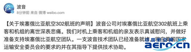 北京時間10日晚,波音公司在新浪微博發布中文聲明: