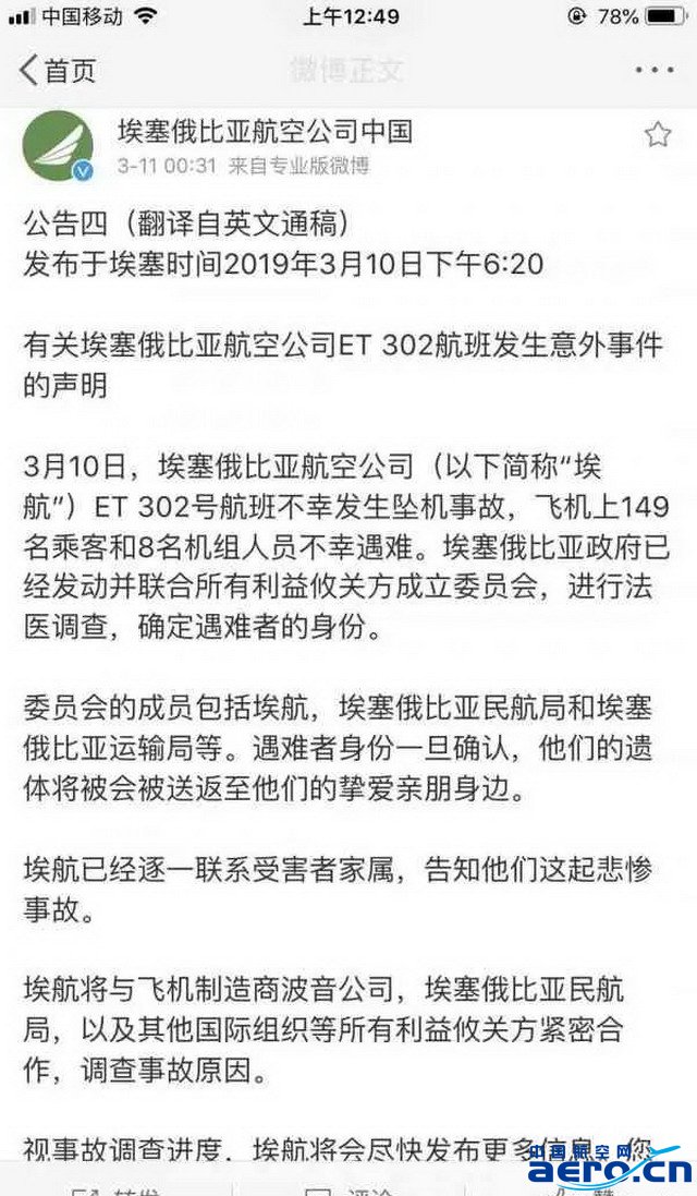 3月11日凌晨,埃塞俄比亞航空發(fā)布兩則最新公告。根據(jù)公告,10日下午,在埃塞俄比亞航空公司總部舉行的新聞發(fā)布會(huì)上,埃航集團(tuán)首席執(zhí)行官表示:“現(xiàn)在推測(cè)事故發(fā)生原因?yàn)闀r(shí)尚早。埃航將與飛機(jī)制造商波音公司,埃塞俄比亞民航局,以及其他致力于維護(hù)國(guó)際標(biāo)準(zhǔn)的國(guó)際組織等所有利益攸關(guān)方緊密合作,展開(kāi)調(diào)查以找出事故原因,并將在原因確定后,對(duì)外發(fā)布。”