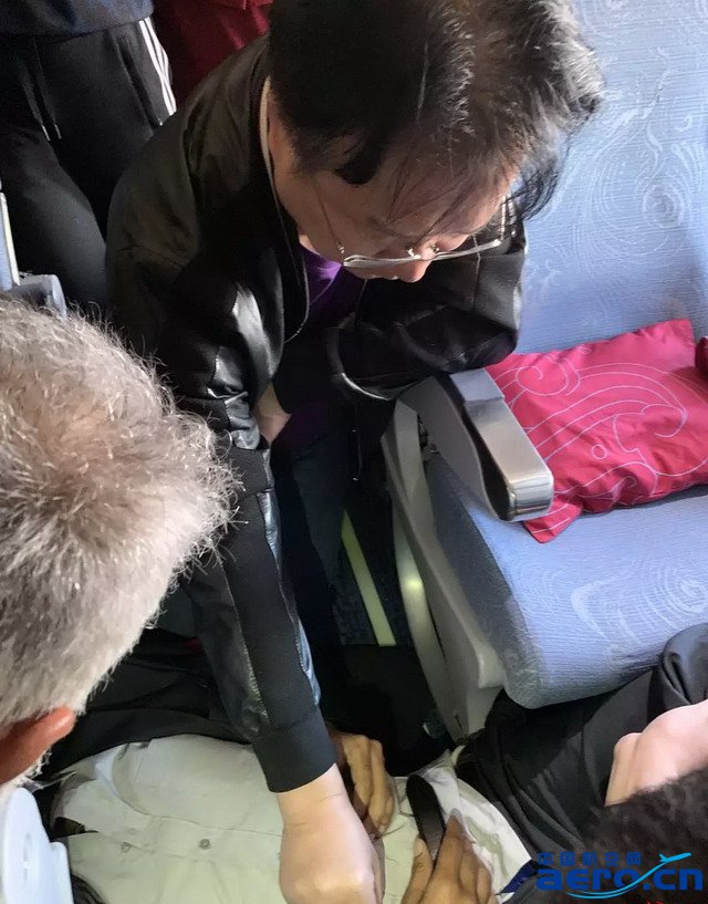 當她把針灸用具拿出來時,楊思進教授給患者扎了幾個穴位,當時疼痛有所緩解,大家就把患者扶起來,把幾張椅子的扶手拉起來,讓患者平躺在幾張椅子上。當時兩個空姐專門在現場記錄情況,包括哪個時候扎的銀針等。