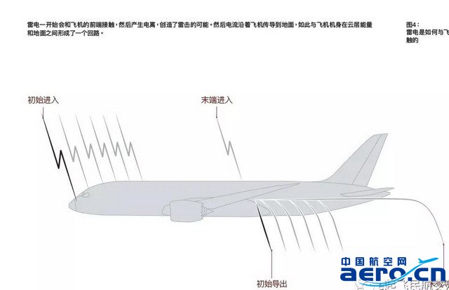 雷電從一個端點進入飛機,又從另一個端點離開飛機(如下圖4)。一些很典型的接觸點包括天線罩、前部機身、機艙、尾翼以及翼尖。