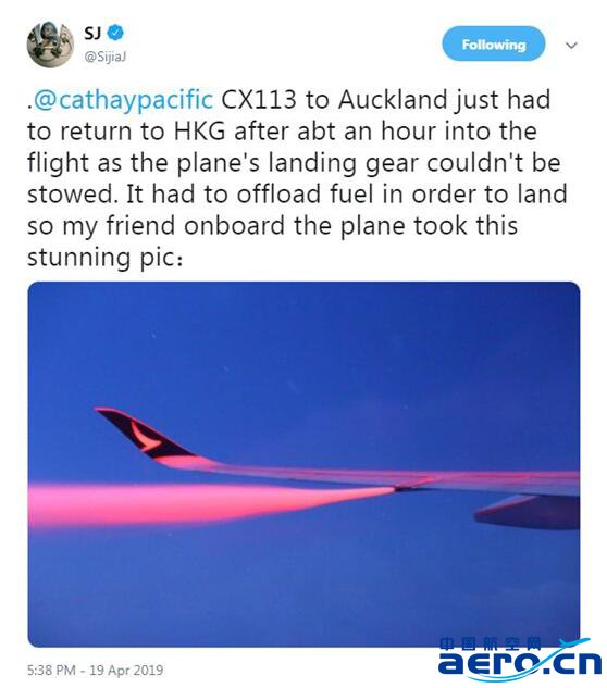 路透社記者蔣思佳(音譯)在其個(gè)人認(rèn)證推特上發(fā)文稱,她的一名朋友當(dāng)時(shí)正好在CX113次航班的飛機(jī)上,并在飛機(jī)返航時(shí),拍攝下了一張美麗的照片。