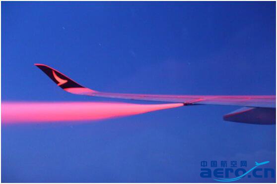 這張照片拍攝到了飛機(jī)的一側(cè)機(jī)翼,飛機(jī)正在排放的燃料在夕陽的映照下呈現(xiàn)粉紅色,十分好看。