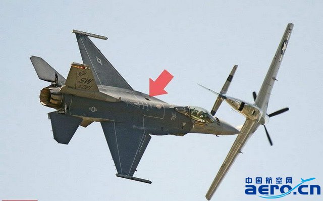 8月2日,在美國密歇根州羅穆盧斯舉行的密歇根航展上,一架美國空軍的F-16戰斗機在進行飛行表演時,一塊航炮艙上方的檢修面板意外脫落(紅箭頭處),背景中還有一架二戰P-51戰機。