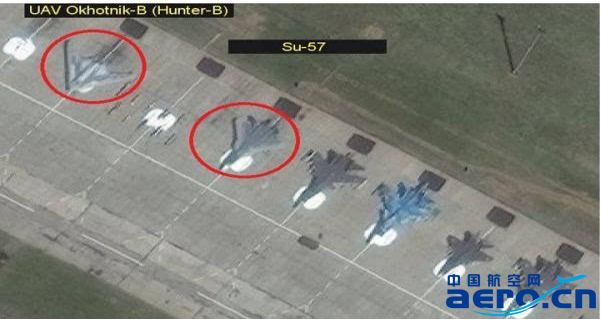 資料圖片:網上流傳的俄“獵人”無人戰機與蘇-57并排停放的衛星照片。(圖片來源于網絡)