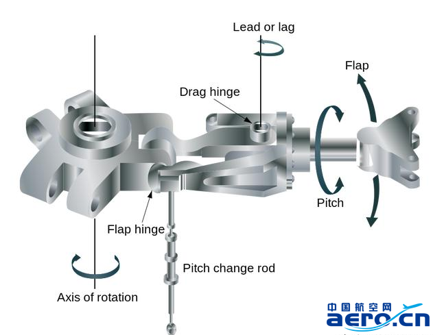 ▲槳葉揮舞鉸(Flap Hinge)和擺振鉸(Lead and Lag Hinge)示意圖