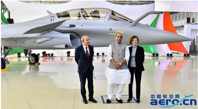 當地時間10月8日,法國梅里尼亞克,印度空軍訂購的首架“陣風”戰機日前在法國達索公司下線,印度國防部長拉杰納特·辛格訪問法國出席了交付儀式。(圖片來源:視覺中國)