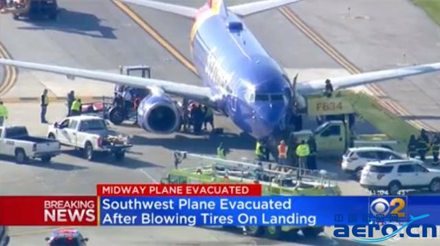 美國西南航空(Southwest Airlines)一架波音737飛機在抵達芝加哥中途國際機場(Chicago Midway International Airport)時遇到機械故障,還有至少兩個輪胎爆胎,緊急救援人員趕到現場處置,旅客通過登機梯撤離。