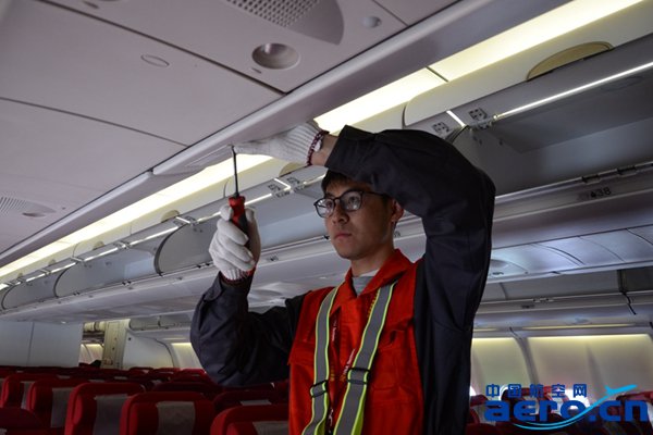 清潔進氣格柵,更換客艙溫度傳感器氣濾。這個工作看似簡單,但其實更考驗機務人員的耐心,拆卸和安裝過程中不能使薄薄的格柵有一丁點的損壞。A檢工作至關(guān)重要,每一個小細節(jié)都需要萬分注意。