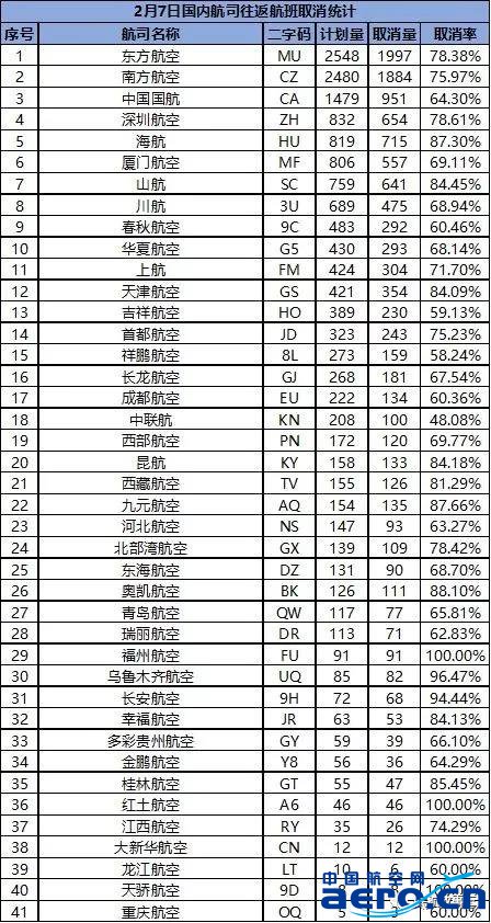 根據飛常準數據統計,2月7日,41家中國內地航空公司計劃執飛航班15862架次,總計取消航班11746架次。 航班取消率100%的有:海航系的福州航空和大新華航空、天驕航空、紅土航空。 航班取消率在85%以上的有:海南航空、九元航空、奧凱航空、烏魯木齊航空、長安航空、桂林航空。