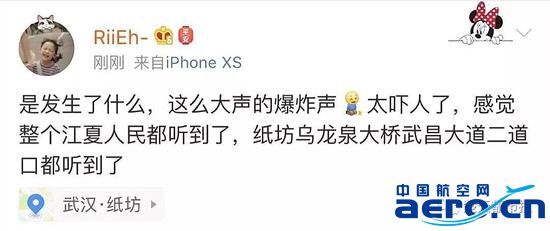 坐標江夏的網友“王念哲”稱,12時37分聽到一聲巨響,隨后持續了七八分鐘的飛機轟鳴聲。位于江夏紙坊的網友“朱聶聶聶聶”則稱,周邊一直有飛機飛過。同在江夏區的網友“漫月”則稱,巨響時他正在家中吃飯,當時窗戶和桌子都震動起來,一開始他還以為是地震,嚇得跑到了陽臺上。