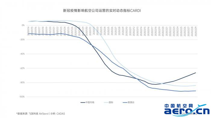 邱連中運用飛友科技AirSavvi提供的中國航空公司分地區實際投放的航班座位的2019年與2020年每日數據作調整后相比較,做成CARDI(即新冠疫情影響航空公司運營的實時動態指標),來定量分析疫情的影響及實時觀測曲線的變動。