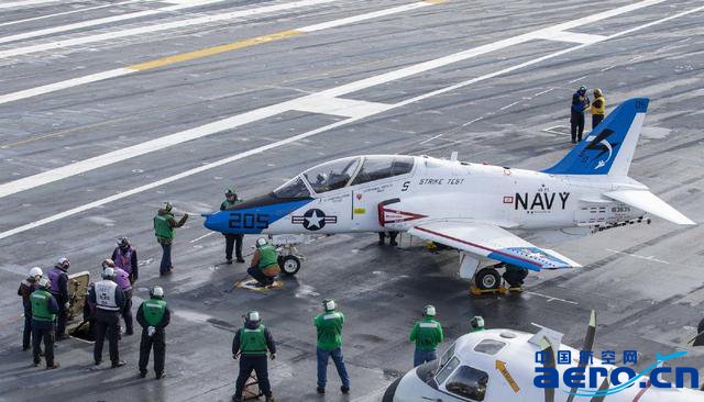 目前美海軍F/A-18E/F“超級大黃蜂”、EA-18G“咆哮者”、F-35C等艦載機的飛行員在駕機上艦時,必須首先在T-45C“蒼鷹”教練機上大量練習。