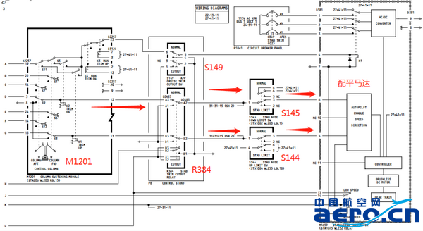 在低速大推力情況下,AP未銜接時(shí),F(xiàn)CC A、B的速度配平信號(hào)經(jīng)過(guò)駕駛桿電門(mén)組件M1201,再經(jīng)過(guò)自動(dòng)駕駛安定面配平切斷電門(mén)S149、安定面向上/向下限制電門(mén)S144、S145,到達(dá)安定面配平馬達(dá)。安定面配平馬達(dá)帶動(dòng)齒輪箱轉(zhuǎn)動(dòng),帶動(dòng)絲杠轉(zhuǎn)動(dòng),作動(dòng)安定面。