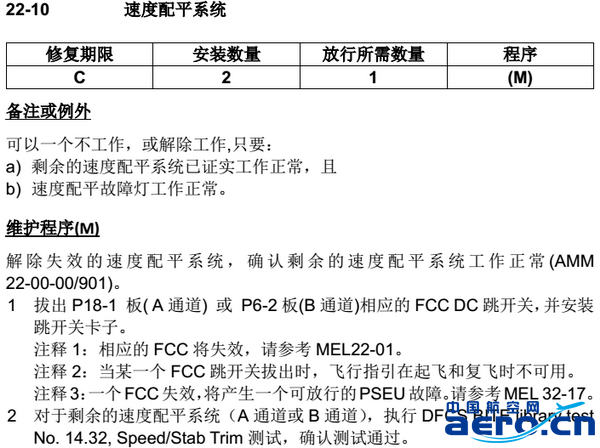 沒(méi)有專(zhuān)門(mén)針對(duì)自動(dòng)駕駛安定面配平功能的保留條目,但由于自動(dòng)駕駛安定面配平是自動(dòng)駕駛的一部分功能,當(dāng)自動(dòng)駕駛安定面配平失效時(shí)(需確保電配平工作正常),可以通過(guò)MEL 22-01保留一套或兩套自動(dòng)駕駛。