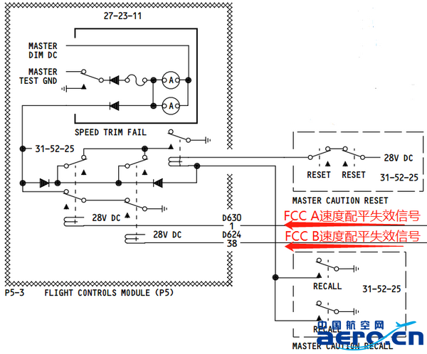 當(dāng)只有1個(gè)FCC的速度配平功能失效時(shí),不會(huì)自動(dòng)點(diǎn)亮速度配平失效燈,按壓再現(xiàn)牌會(huì)點(diǎn)亮失效燈,按壓主警告電門(mén)可以復(fù)位。當(dāng)2個(gè)FCC均失效時(shí),速度配平失效燈將常亮,無(wú)法復(fù)位。