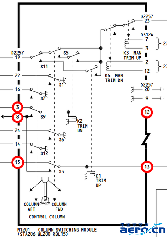 針對FIM中提到的R384安定面配平切斷繼電器,由于開關(A1、A2、A3)與開關(D1、D2、D3)同步做動,基本上可以排除R384繼電器的故障可能。而M1201中的S3、S9分別在駕駛桿前推、后拉時閉合,所以故障可能性最高的就是M1201和S145。