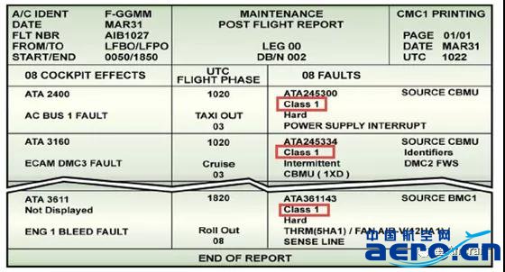 這些故障對系統(tǒng)的運行狀況沒有影響。然而,通過在下一次計劃維護任務之前糾正這些錯誤,可以顯著提高飛機的調(diào)度可靠性和/或降低維護成本。相關故障都包含在飛機特定計算機的二級維護信息(CLASS 2)中。在飛行結束后的飛行后報告(PFR)中顯示。