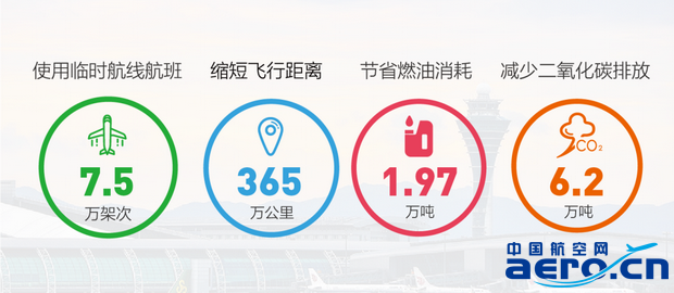 2020年1月1日至5月底期間,共計有7.5萬架次航班使用臨時航線,縮短飛行距離365萬公里,節省燃油消耗1.97萬噸,減少二氧化碳排放約6.2萬噸。