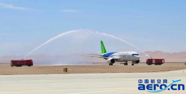 敦煌莫高國際機(jī)場高度重視,以民航最高禮儀——“過水門”的方式熱烈歡迎C919抵達(dá)。