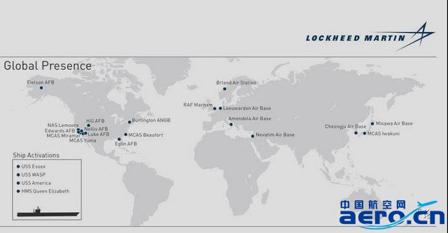 目前F-35的全球部署基地為24個,其中20個為陸上基地;4個海上機動平臺是:美國海軍陸戰隊的“埃塞克斯”號(LHD-2)、“黃蜂”號(LHD-1)、“美國”號(LHA-6)兩棲攻擊艦和英國皇家海軍的“伊麗莎白女王”號航母(R08)。
