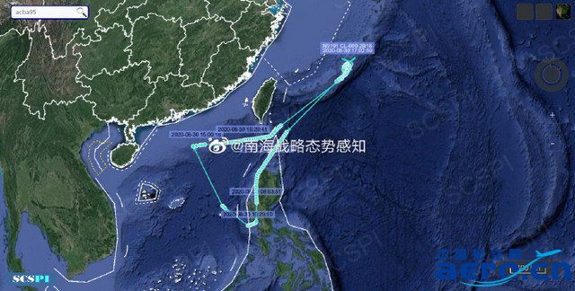據“南海戰略態勢感知”計劃平臺8月30日發布的消息美國海軍EP-3E偵察機飛行軌跡
