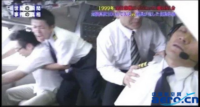 駕駛艙外,副駕駛山內機長和其他乘務員聽到報警聲,知道情況危急,他們合力打開了駕駛艙,抓住了正在忙碌于操縱桿的西沢,將他拖出來按住,幾個乘客用領帶綁住了他的手腳。