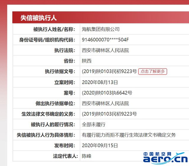 9月15日,中國執行信息公開網披露的信息顯示,西安市碑林區人民法院于2020年08月13日立案執行申請人柴靖申請執行海航集團有限公司合同糾紛一案,因海航集團未按執行通知書指定的期間履行生效法律文書確定的給付義務,法院依照規定,對海航集團采取限制消費措施,限制海航集團及法定代表人陳峰不得實施高消費及非生活和工作必需的消費行為。
