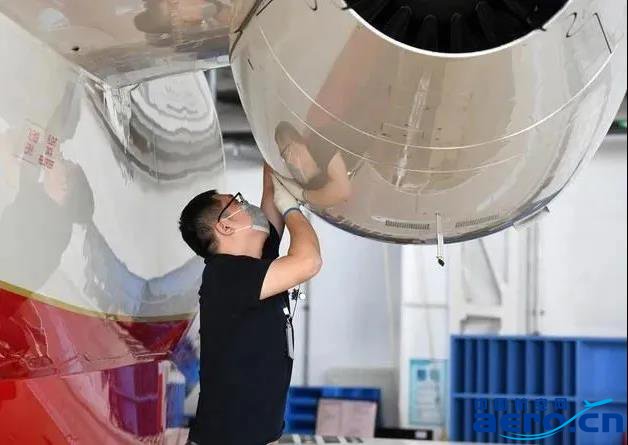 ↑9月17日,天津海特飛機(jī)工程有限公司工作人員在機(jī)庫(kù)內(nèi)進(jìn)行維修作業(yè)。