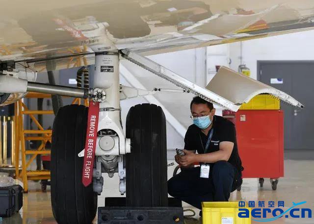 ↑ 9月17日,龐巴迪(天津)航空服務(wù)有限公司工作人員在車間內(nèi)進(jìn)行檢測(cè)作業(yè)。
