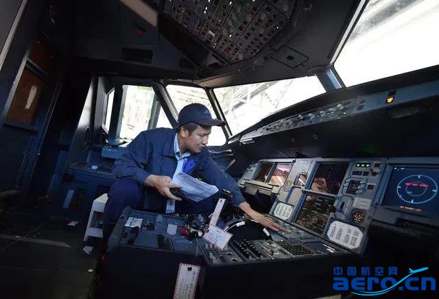 ↑9月17日,天津海特飛機(jī)工程有限公司工作人員在飛機(jī)機(jī)艙內(nèi)進(jìn)行檢測(cè)作業(yè)。