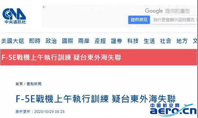 據臺灣中時新聞網10月29日報道,今天(29日)清晨,臺東志航基地墜海的空軍第七聯隊F-5E單座戰機,由飛行員朱冠甍駕駛執行任務,起飛2分鐘后就因發動機失效,緊急向塔臺匯報后跳傘逃生,但因為當時臺東外海風勢強大且海象不佳,飛行員順利跳傘后落海,卻因為海象差,被傘繩纏住而大量吃水,幸好救援人員在最短時間內發現朱冠甍并將他吊掛回到基地送往馬偕醫院,中時新聞網最新消息稱,但經搶救后仍于9點27分宣告不治。