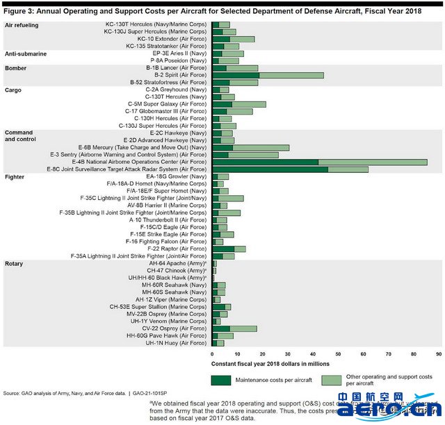 11月19日,GAO在其官網上公布了一份有關美軍軍用飛機任務率的報告,選取并分析了海陸空及海軍陸戰隊的46型飛機在2011~2019財年的任務率,另涉及這些飛機的運營和維護成本的波動。報告指出,2018財年,飛機的運營和維護成本高達493.3億美元,從海軍KC-130T“大力神”機隊的1.18億美元至空軍KC-135T“同溫層加油機”的42.4億美元不等。之所以存在如此巨大的差異,在于機隊規模不同。其中,維護成本占比44%,達到了215.2億美元。在所有的軍用飛機中,每架E-4B“國家空中指揮中心”的運營和維護成本超過8500萬美元,堪稱最“燒錢”飛機。排在其后的則是E-8C“聯合監視目標攻擊雷達系統”(6200萬美元)和B-2“幽靈”隱形轟炸機(4427萬美元)。