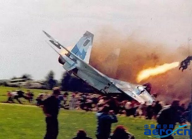 2002年烏克蘭舉行的飛行表演,一架蘇-27俯沖后爬升失速,這是一次十分慘烈的彈射,飛機失控在沖向人群爆炸的前一刻,兩名飛行員成功彈射跳傘。這次事故中有77名觀眾死亡。↑