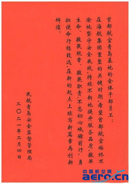 首都航空青島基地深入貫徹習近平總書記對民航工作的重要指示批示精神,嚴守航空安全底線,不斷強化“三基”建設,層層壓實安全責任,持續強化系統性安全管理,結合疫情防控等突出問題的衍生風險,認真執行民航局、海航集團及首都航空公司總部安全管理工作部署,持續推進航空安全工作規劃各項要求落實,整體安全管理水平不斷提升。未來首都航空青島基地將繼續在民航局、海航集團和公司的正確領導下,圓滿完成戰疫情、保平安、促生產等各項工作,在新的一年將持續提高政治站位,嚴守航空安全紅線,為每一名旅客提供安全便捷的真情服務。
