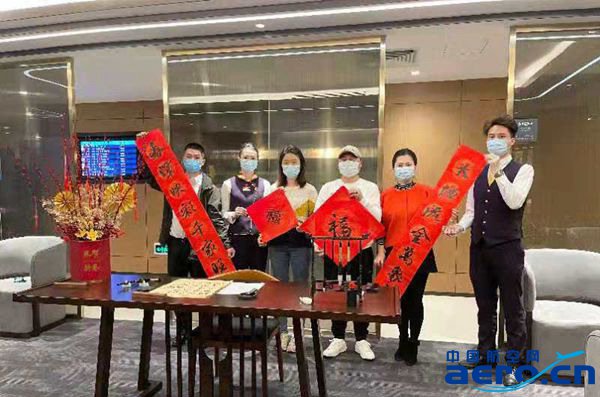 太原、廣州、海口、西安貴賓室的旅客紛紛拿起毛筆在紅紙上寫下對(duì)海航的祝福和新年愿景。太原貴賓室獻(xiàn)上藏頭詩“海納百川東風(fēng)暖 航程萬里服務(wù)臻”,廣州貴賓室邀請(qǐng)旅客一同參與新春對(duì)聯(lián)活動(dòng),寫下“平安吉祥年 健康如意春”、“春暉映彩千家旺 大地流金萬象新”等對(duì)新年的美好期盼。