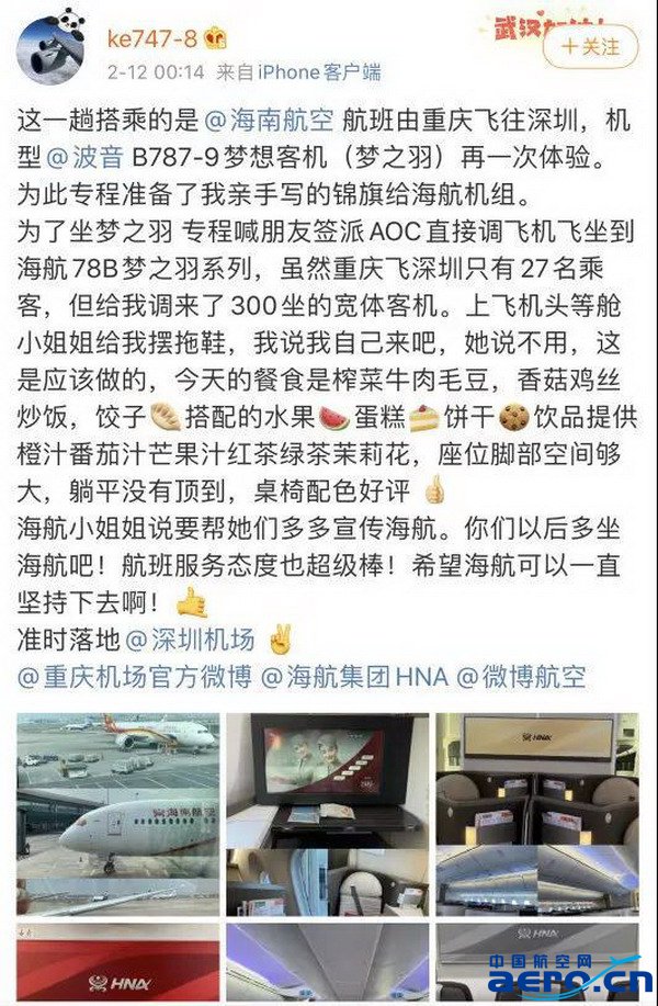 一名微博網友 2月12日凌晨發微博稱,為了乘坐海南航空的“夢之羽”,他專程喊朋友簽派AOC直接調飛機,雖然重慶到深圳只有27名乘客,但是給他調來了300座的寬體飛機。他還專門準備了錦旗送給了海航機組。