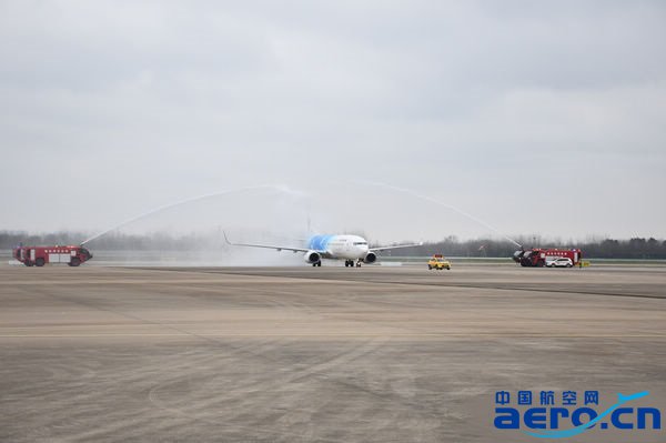 首航飛機抵達英雄之城武漢,接受民航界最高禮遇“過水門”儀式的迎接(徐志祥/攝)