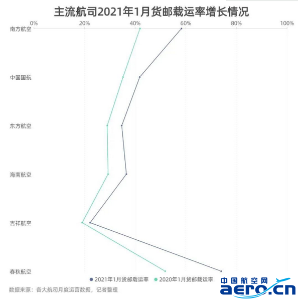 值得一提的是,春秋航空在貨運領域發展迅猛,盡管1月貨運及郵運量為上市航司最低水平(0.75萬噸),但不管是載運量增速,還是載運率,春秋航空都領先同行。今年1月,春秋航空的貨運及郵運量同比增長29.44%,貨郵載運率也高達73.95%,同比增長22.11個百分點。