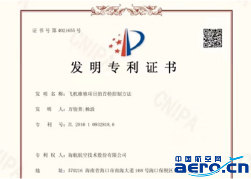 圖:海航技術《飛機維修項目的首檢控制方法》獲得發明專利證書