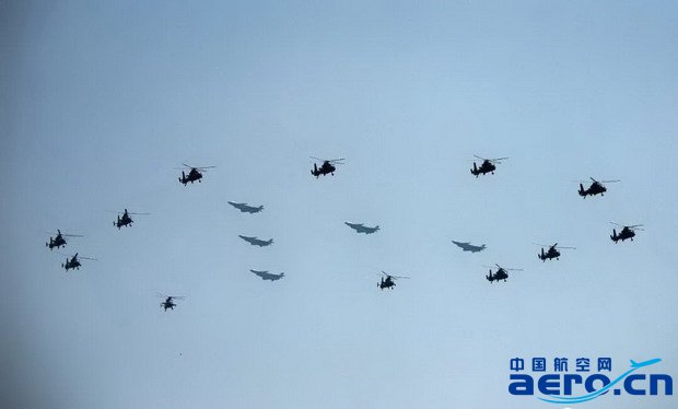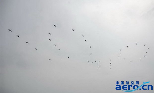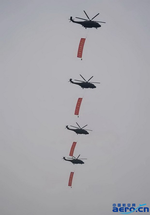 此次參演的空中梯隊依次是空中護旗梯隊、空中“數字”梯隊、殲擊機梯隊和教練機梯隊。其中,空中護旗梯隊護衛黨旗并掛裝“偉大的中國共產黨萬歲”“偉大的中國人民萬歲”“偉大的中華人民共和國萬歲”“全國各族人民大團結萬歲”慶祝標語,率先通過天安門廣場,拉開飛行慶祝表演序幕。參演直升機所懸掛的標語字幅面積大、空中姿態穩定難,4機同步要求高,航空工業通過前期大量科研鑒定試飛工作,提前攻克難關,令參演裝備能夠以良好的操穩特性和飛行狀態,帶領空中梯隊“米秒不差”飛越天安門廣場。