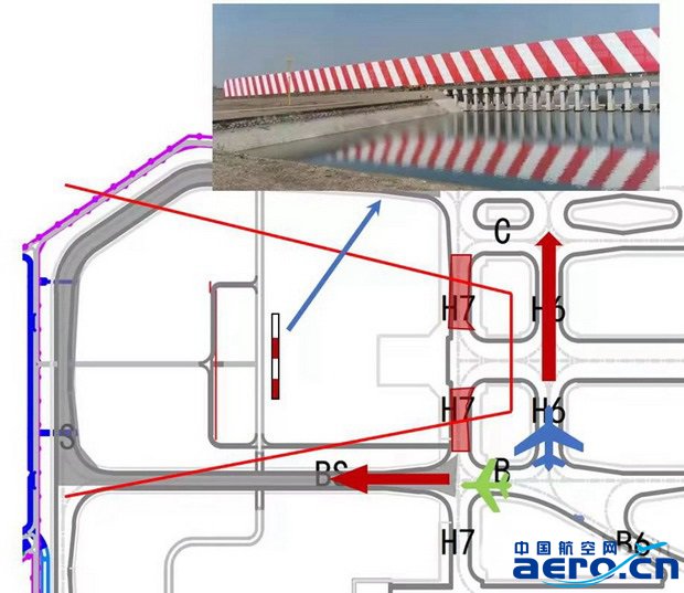 西跑道18R/36L末端內移150米后,繞滑的限制達到C類機的13m限制;H7/H1理論上屬于起飛跑道末端以外,在離港航空器起飛滑跑期間,航空器不得在H7/H1跑道外等待。